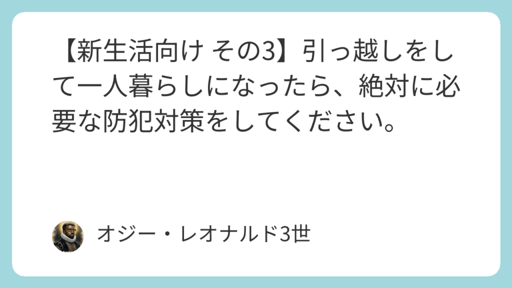 【新生活向け その3】引っ越しをして一人暮らしになったら、絶対に必要な防犯対策をしてください。