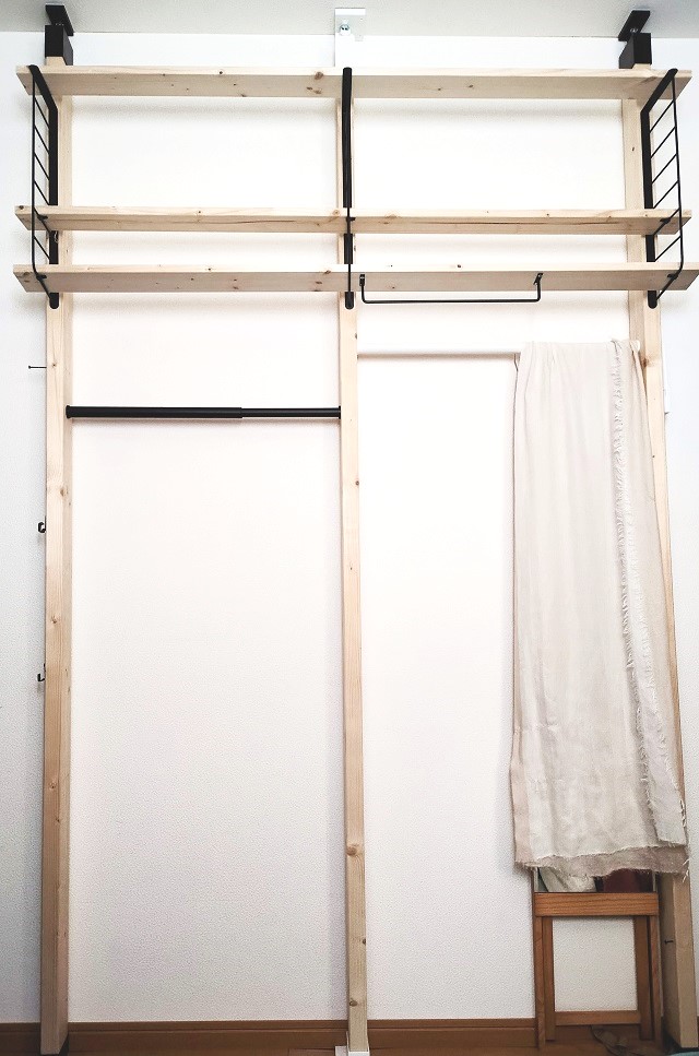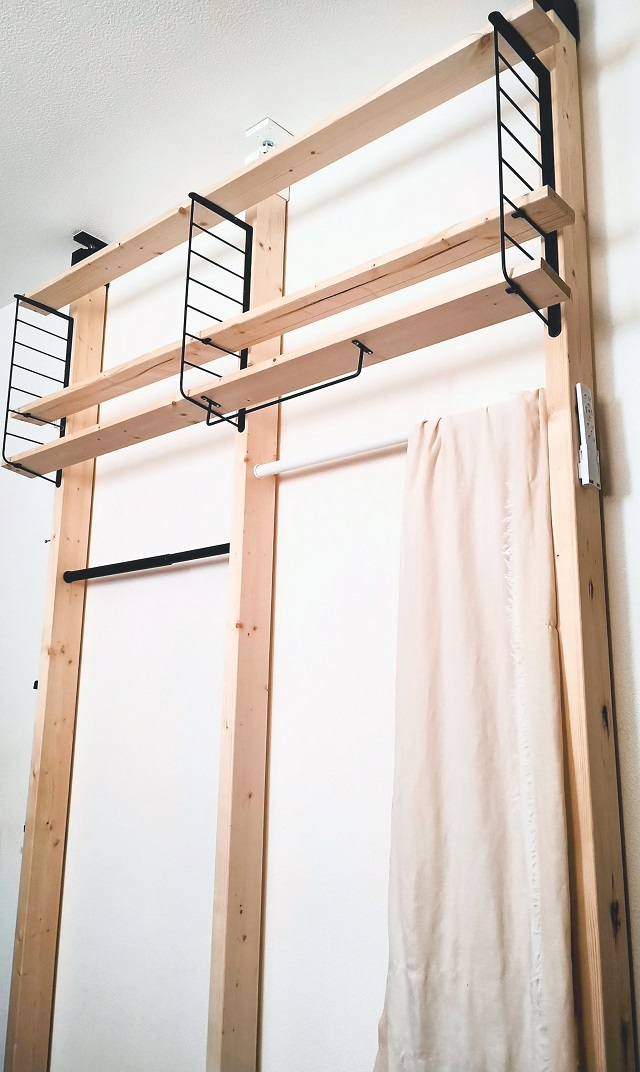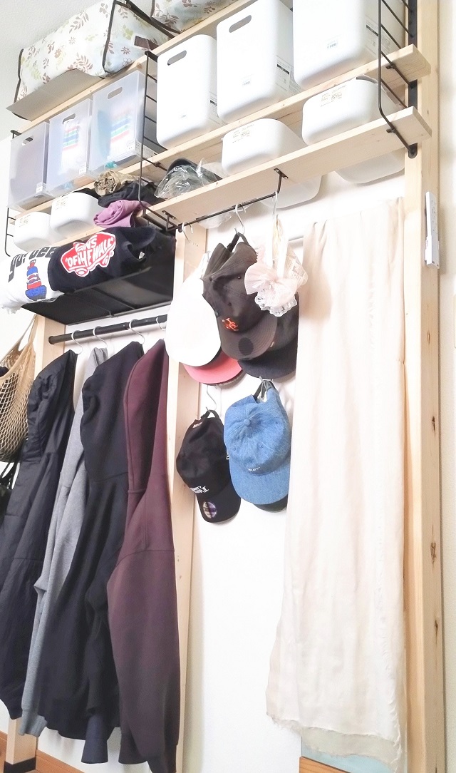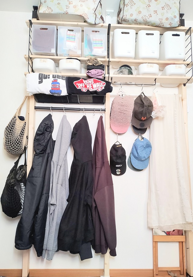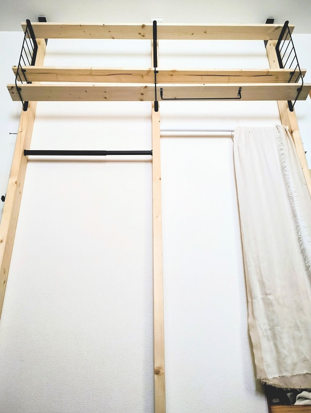 今回は、秋~冬にかけて制作したこともあり、棚の左下部にアウターとパーカーを吊って収納。夏は、ショートパンツ・軽いアウターを吊るすのを想定としています。