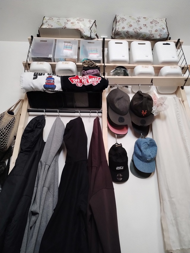 あとは、姿鏡を配置(白い目隠し部分)、キャップを吊るすスペース、シワにならないパンツを畳んで収納するスペース(左サイドの袋内)、残りの収納スペースはフリーとしました。