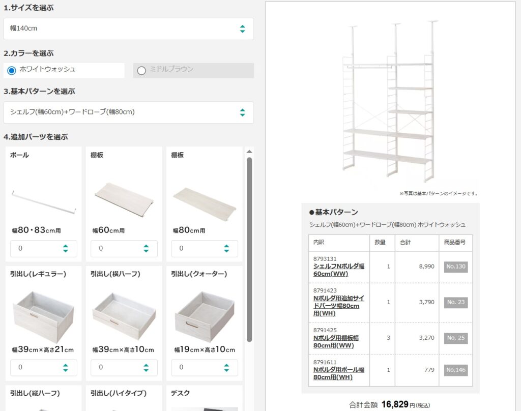 既製品購入の場合、同じ規模の壁面収納は「ニトリ Nポルダシリーズ」が候補となりました。シミュレーションで似た形状にした場合、こちらの形状が似ているかなと思いました。