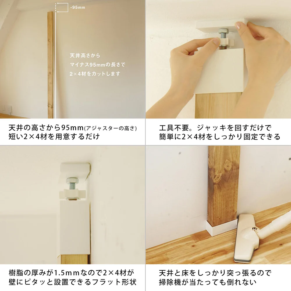 2×4の木材と組み合わせて棚などを作るアジャスター(突っ張り)の事