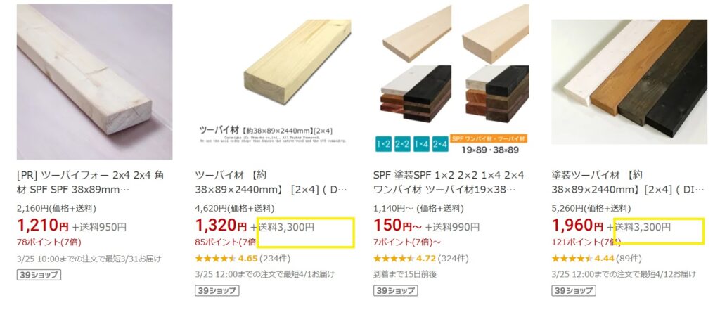 棚を作るにあたり、長い木材をネットショップで購入すると配送料が高い