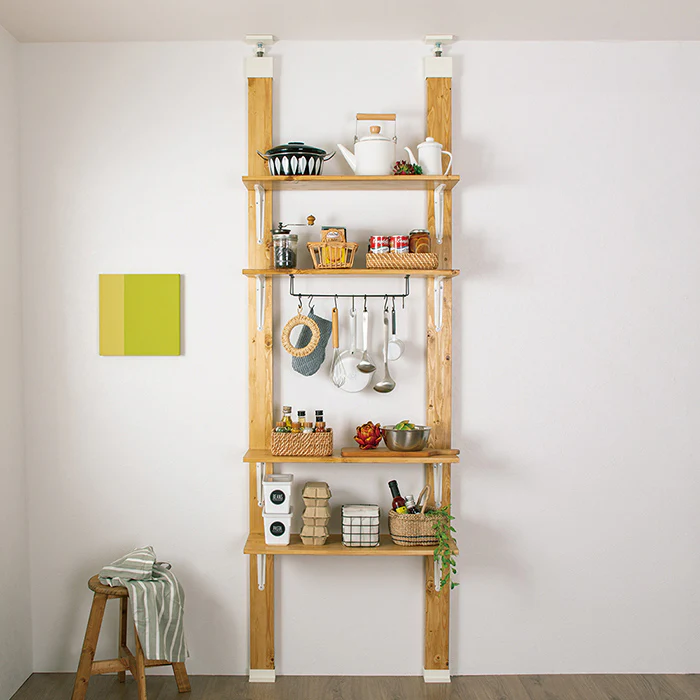 突っ張り部分(柱):ラブリコ 強力タイプ 2×4アジャスター(中央部分)1個+ラブリコ 通常タイプ 2×4アジャスター(両端部分)2個 計3個