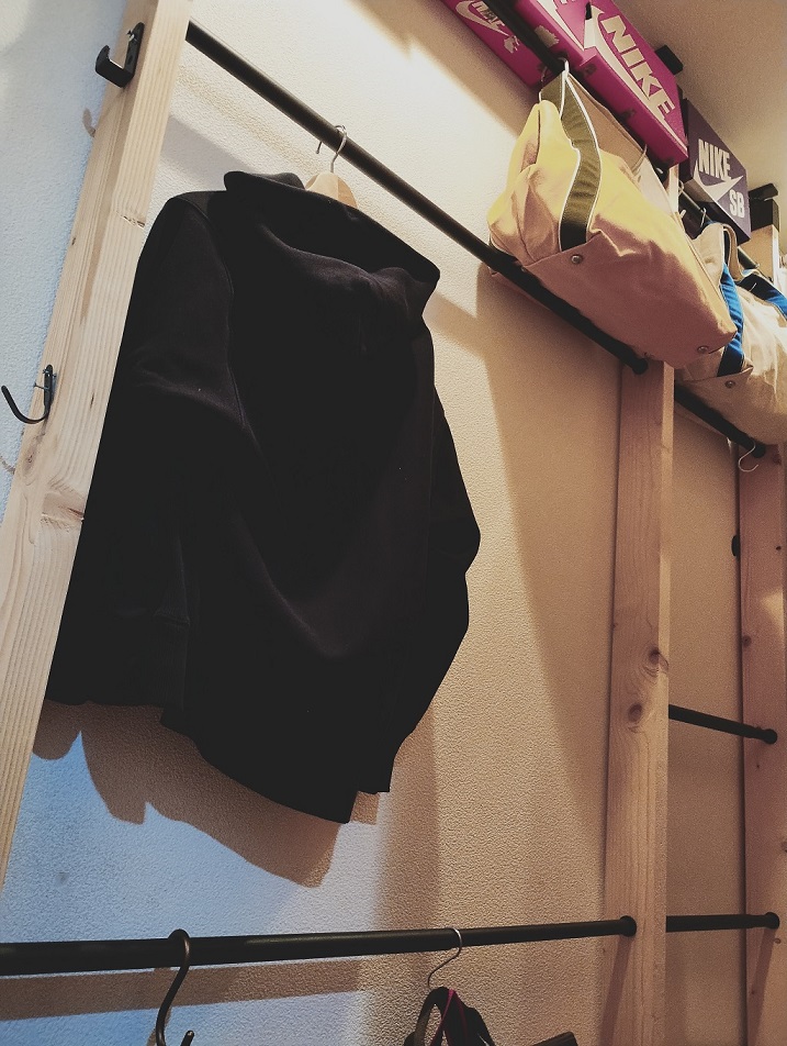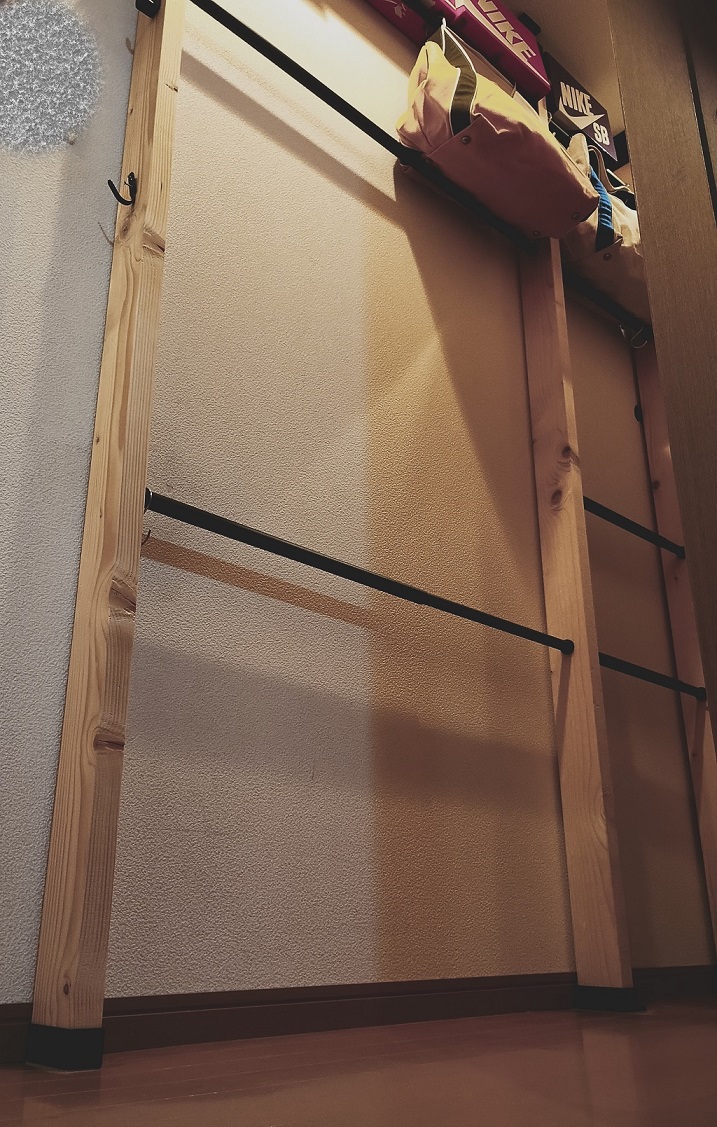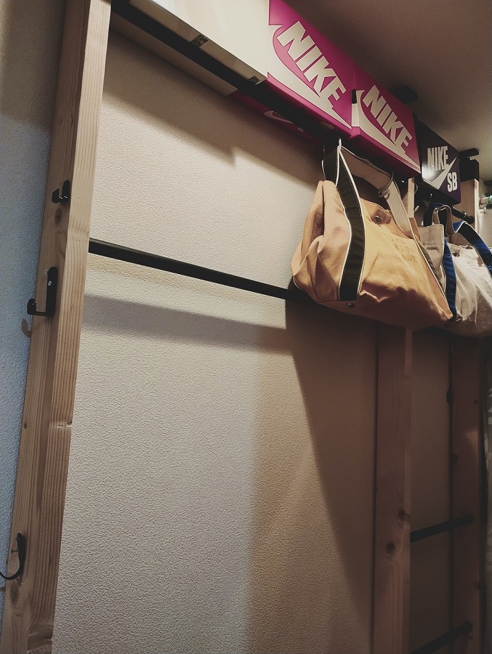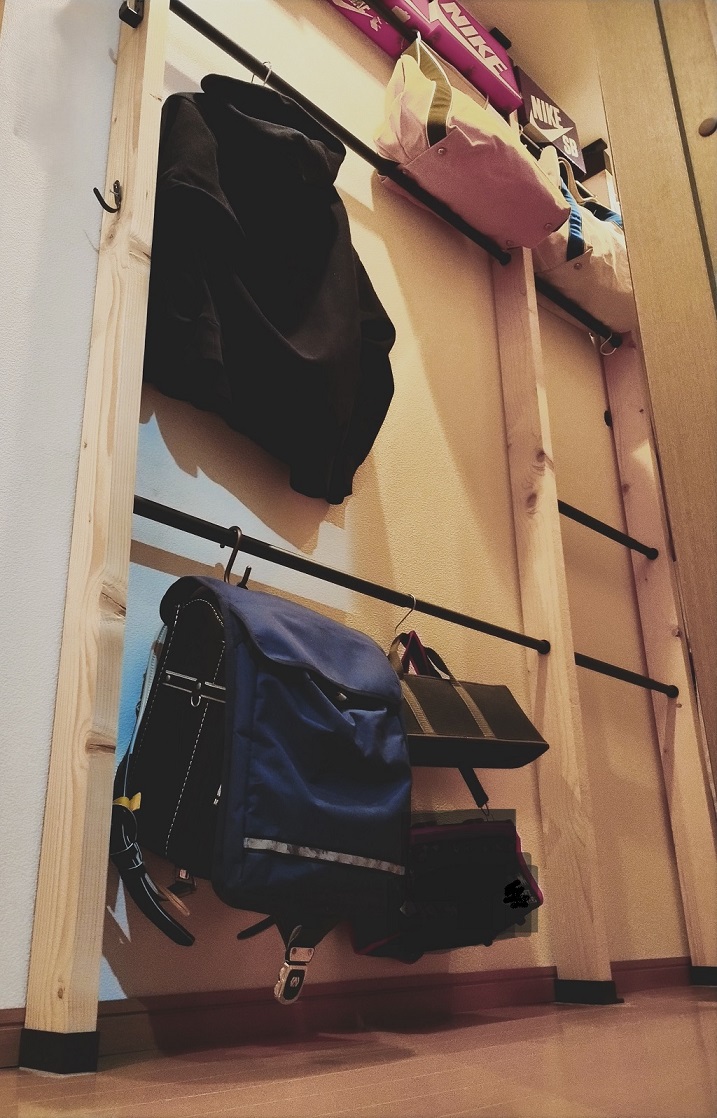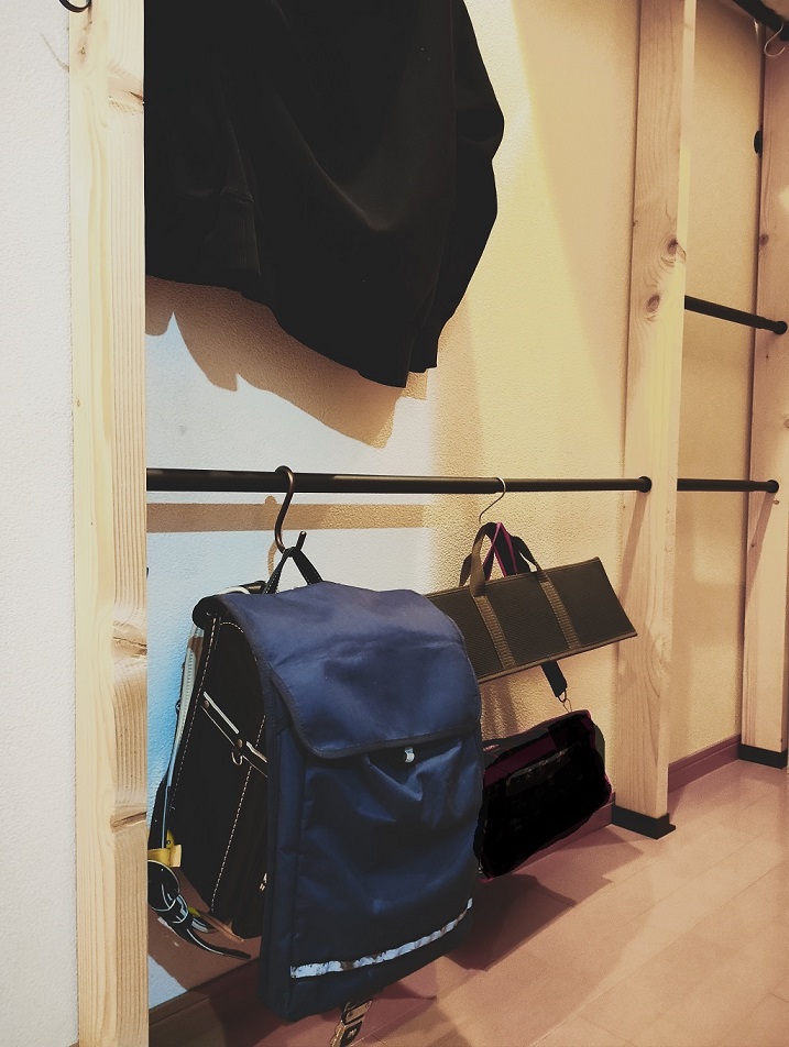 仮置き場として、最初にラブリコを使って柱(2×4木材)を一本立てて、天井に近い上段にフックを設置し、私がランドセルをひっかける(置く)というスタイルを実践していましたが、