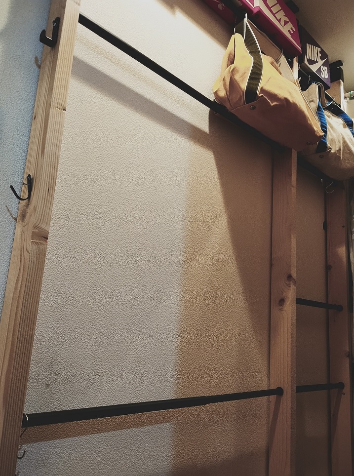 2.突っ張った状態の2×4木材の好みの高さに「ラブリコ 伸縮ロッド S アイアン 幅50〜70cm」を取り付ける。(ハンガーポール)