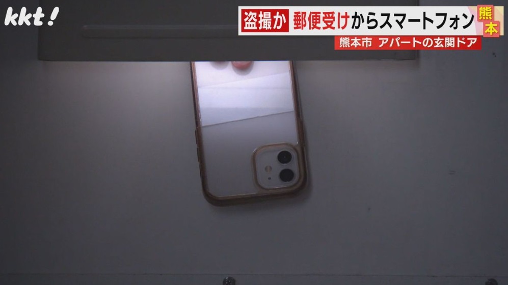 熊本市中央区新町のアパートの一室で事件が起きました。警察によりますと、住民の20代の女性が部屋にいたところ、玄関の郵便受けから物音がしたため、確認したところ、スマートフォンが半分ほど差し込まれていたということです。