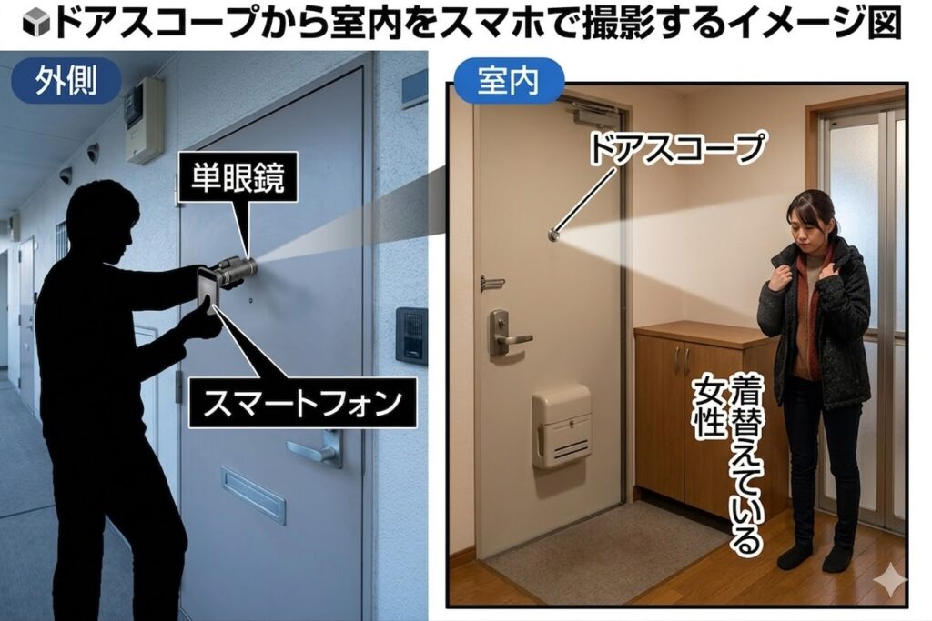 玄関ドアにドアスコープ(訪問者を確認するのぞき穴)がありますが、実は外側からも室内が見れてしまう道具があります。