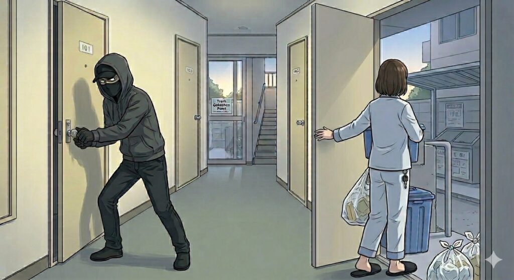 「ゴミを出すだけだから、鍵をかけなくていっか」という考えは捨ててください。侵入者はその一瞬を狙っています。大変危険です。
